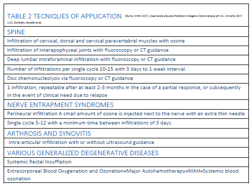 TABLE 2 TECNIQUES OF APPLICATION (Burns, Smith 2017, Linee Guida e Buone Pratiche in Ossigeno Ozono terapia art. 6-L. 8 marzo 2017