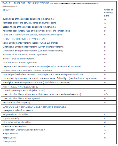 The following table 1 shows the therapeutic indications for ozone therapy.